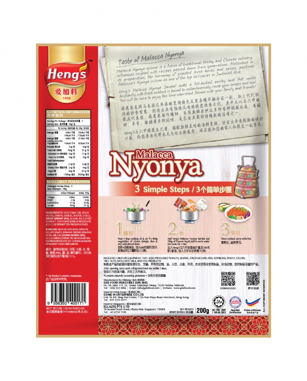Heng’s Malacca Nyonya Sambal coats a full-bodied earthy heat that melds brilliantly with fresh seafood is bound to instantaneously rouse your senses and soul. You will be sure to enjoy this time-cherished flavour with your family and friends!