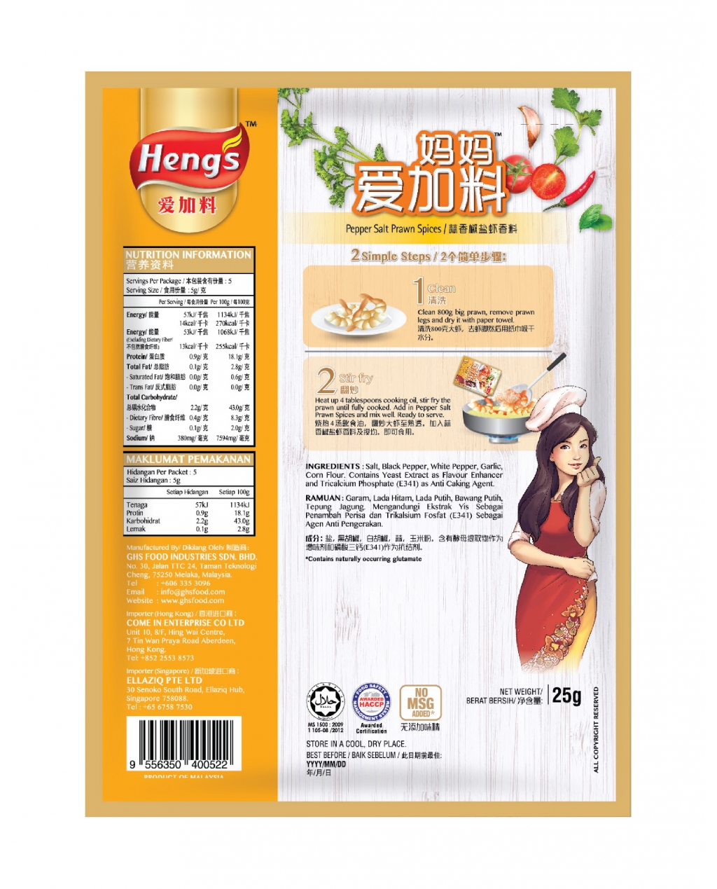 Heng’s Pepper Salt Prawn Mix brings the irresistible flavor of classic Asian stir-fry right to your kitchen.Blended with fragrant garlic, white pepper, and selected spices, it delivers that signature crispy texture and savory aroma that pairs perfectly with prawns or seafood. Every bite is a balance of salt, spice, and crunch — just like your favorite restaurant-style dish. Simply coat and fry for a golden, crispy delight.